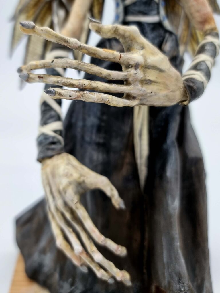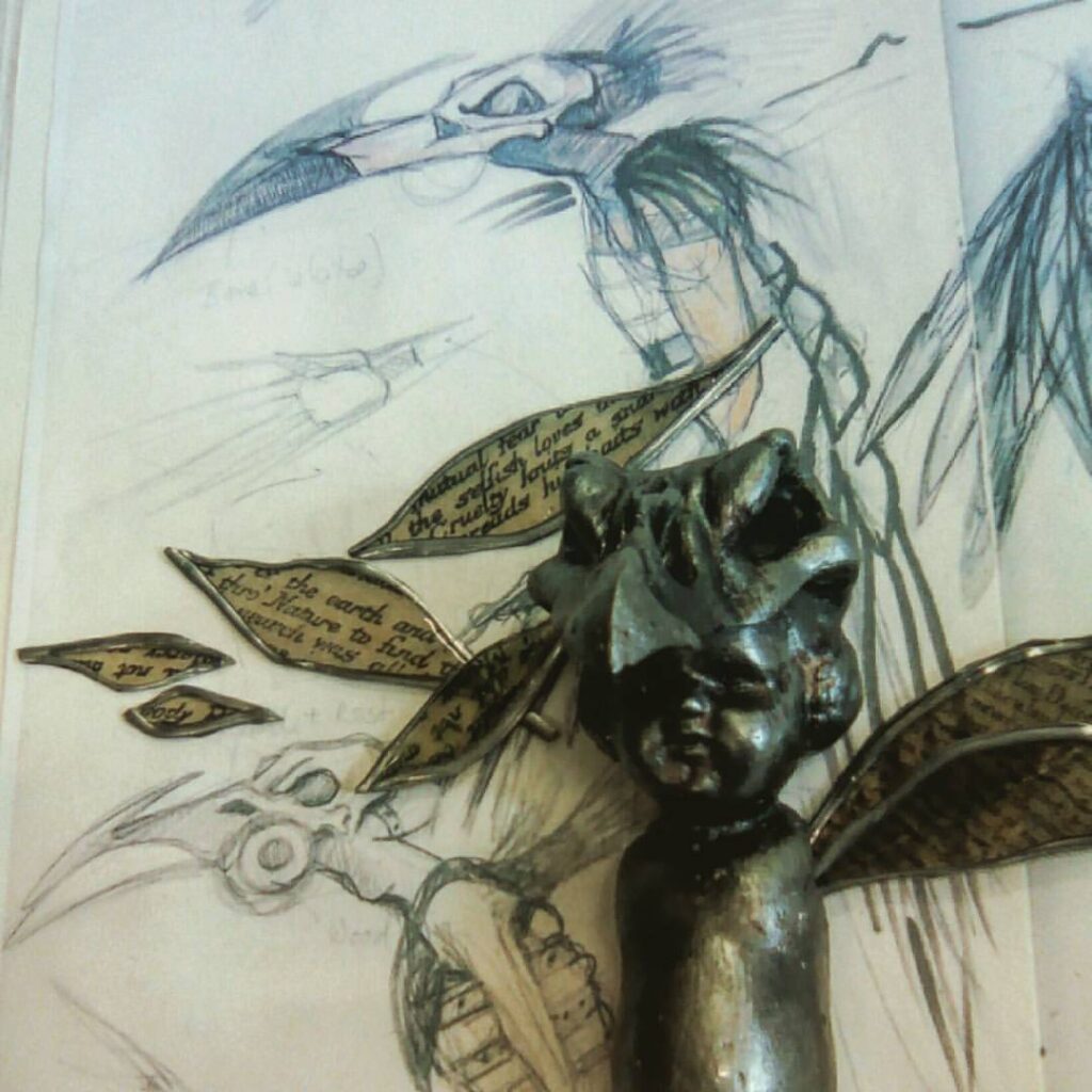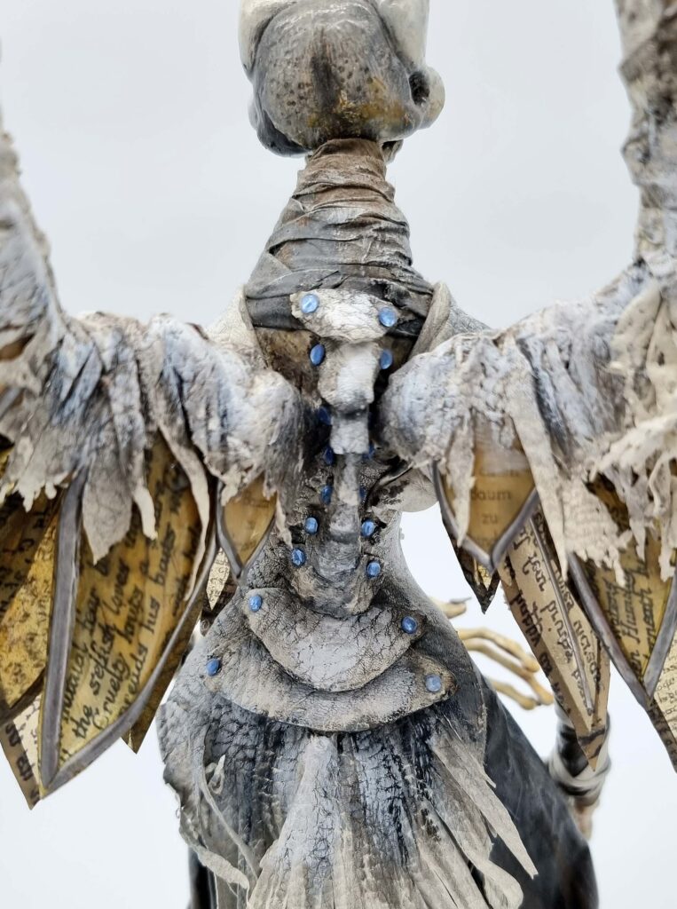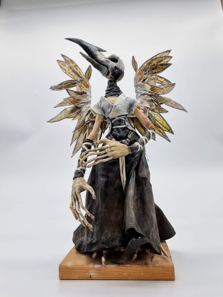 The Ash Bird emerged from a dream during a time of loss and upheaval. After a studio fire had taken both my home and my creative space, I found myself in a dark and fragile state. In that period, a seemingly simple dream appeared: three bird-like figures, part human, part bird, standing together—a large one, a medium, and a small one. They called themselves “The Ash Birds.” The world around them was like a timeless silhouette, a shadowed stage suspended between night and day.